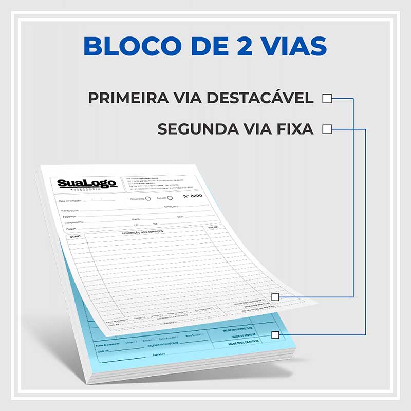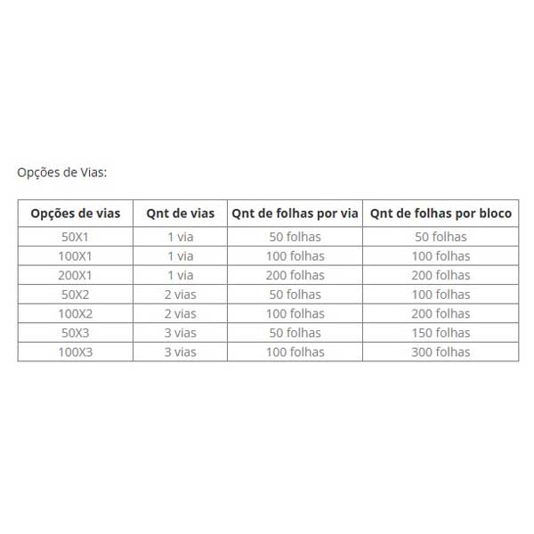 – Bloco 50X2 – Qnt de vias: 2 via s – Qnt de folhas por via: 50 folhas – Qnt de folhas por bloco: 100 folhas